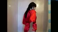 Brunette in a Red Bathrobe Takes a Steamy Shower and Gets Wet